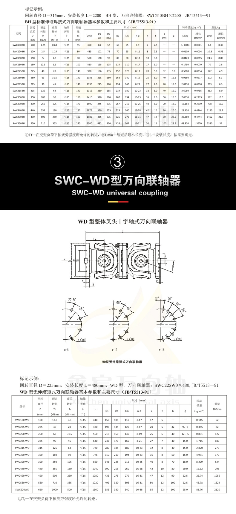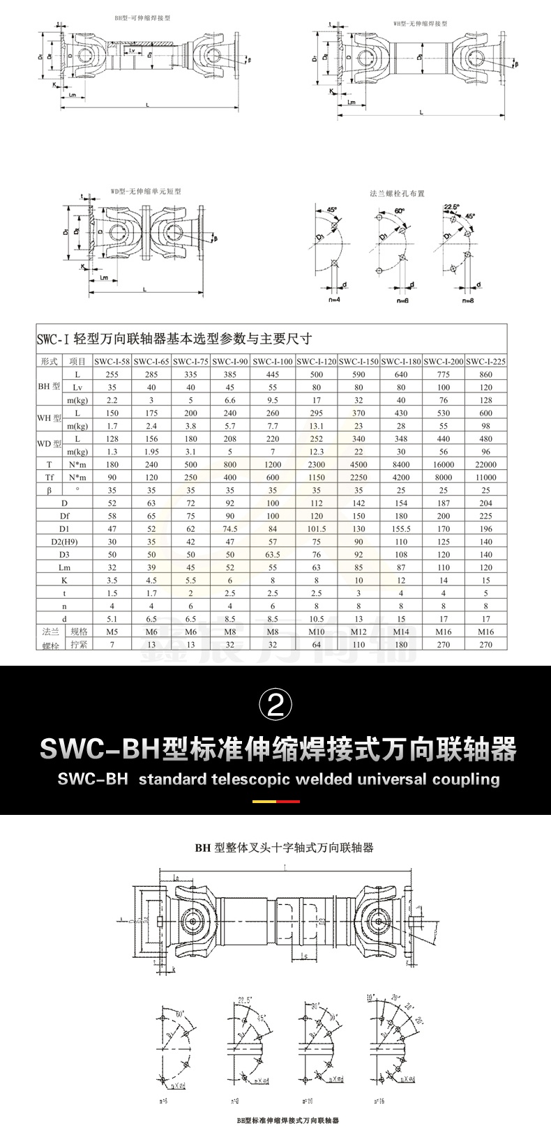 SWC-I型萬向聯(lián)軸器主要適用于造紙?jiān)O(shè)備、普通機(jī)械、水泵設(shè)備和測試試驗(yàn)臺等各類通用機(jī)械場合。聯(lián)接兩個不同軸線的傳動軸系。其法蘭直徑為65-225mm,傳遞額定轉(zhuǎn)矩范圍200-22,000N.m,軸線折角為25°。萬向聯(lián)軸器應(yīng)根據(jù)載荷特性、計算轉(zhuǎn)矩、軸承壽命及工作轉(zhuǎn)速選用。
